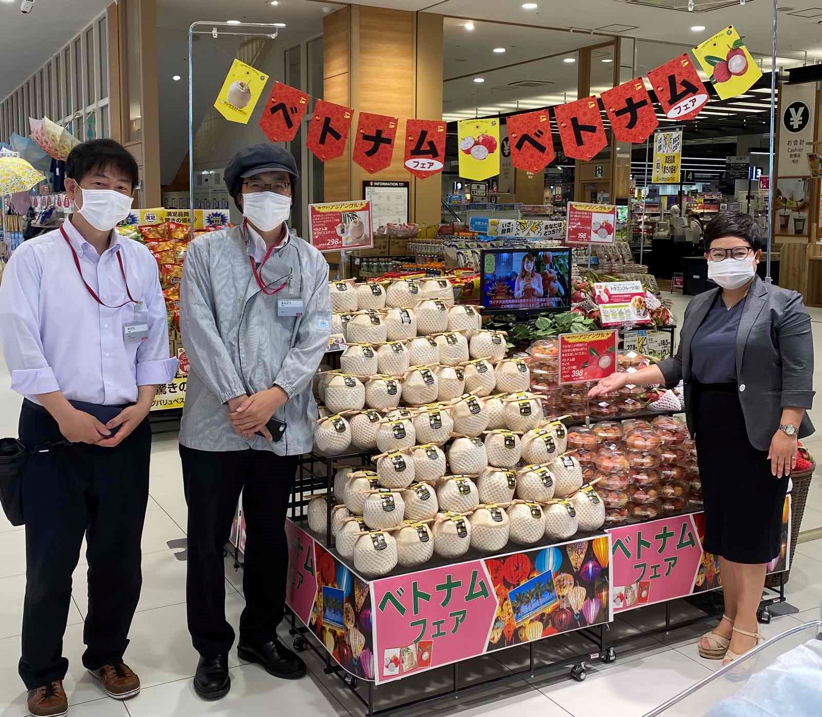 From 25th to 27th June 2021, some fresh Vietnamese fruits (including lychee, coconut, dragonfruit, banana) and some other food products (Hao Hao noodles, instant Phở, frozen fish,…) were introduced, promoted and sold at Aeon supermarkets in Kansai region.