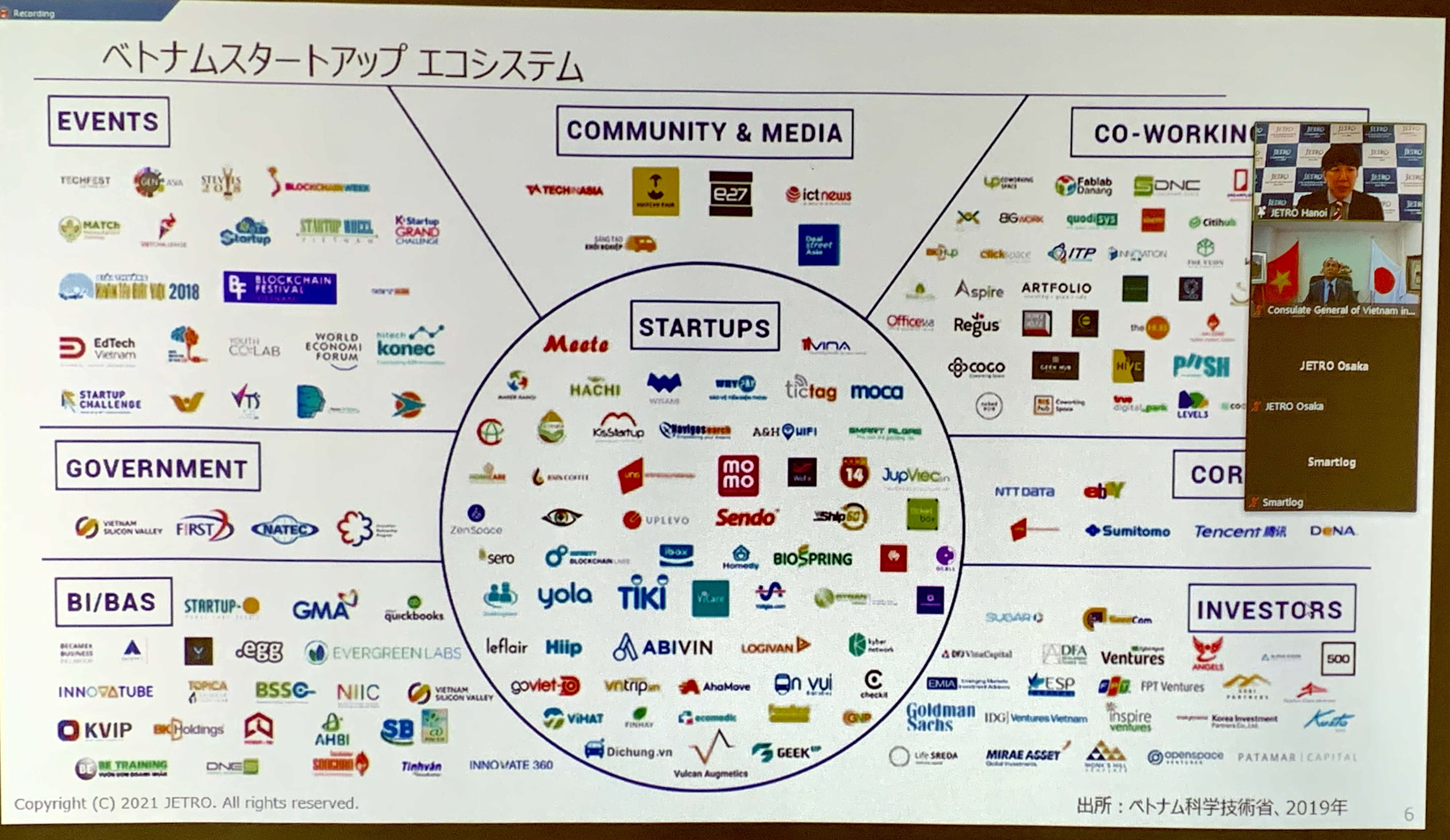 冒頭、在大阪ベトナム総領事館のグエン・ホン・ハー総領事、および関西経済連合会の牛場克彦様より開会挨拶を頂きました。続いて、中島丈雄ジェトロ・ハノイ事務所長が、「ベトナムスタートアップの現在地~日本企業のビジネス機会~」と題し、ベトナムの概況を説明しました。