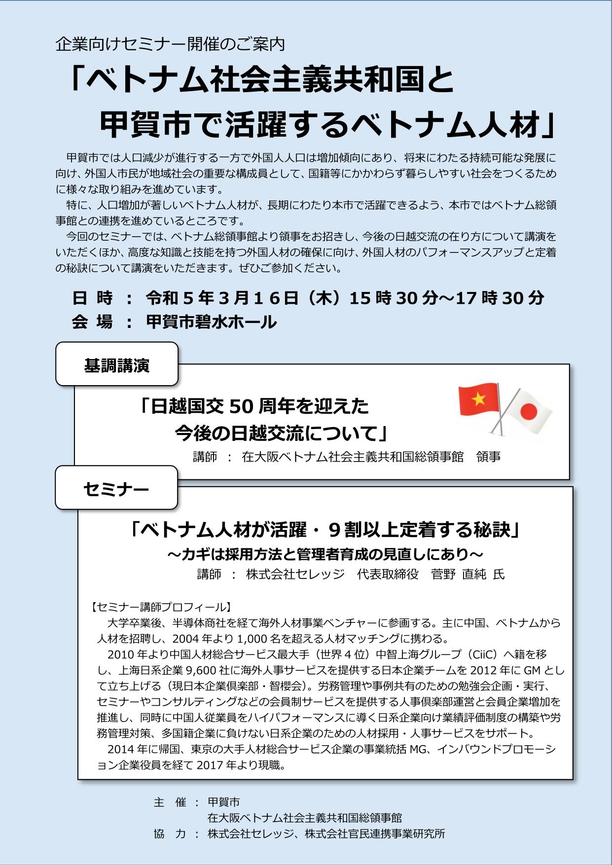 今回のセミナーでは、ベトナム総領事館より領事をお招きし、今後の日越交流の在り方について講演をいただくほか、高度な知識と技能を持つ外国人材の確保に向け、外国人材のパフォーマンスアップと定着の秘訣について講演をいただきます。ぜひご参加ください。